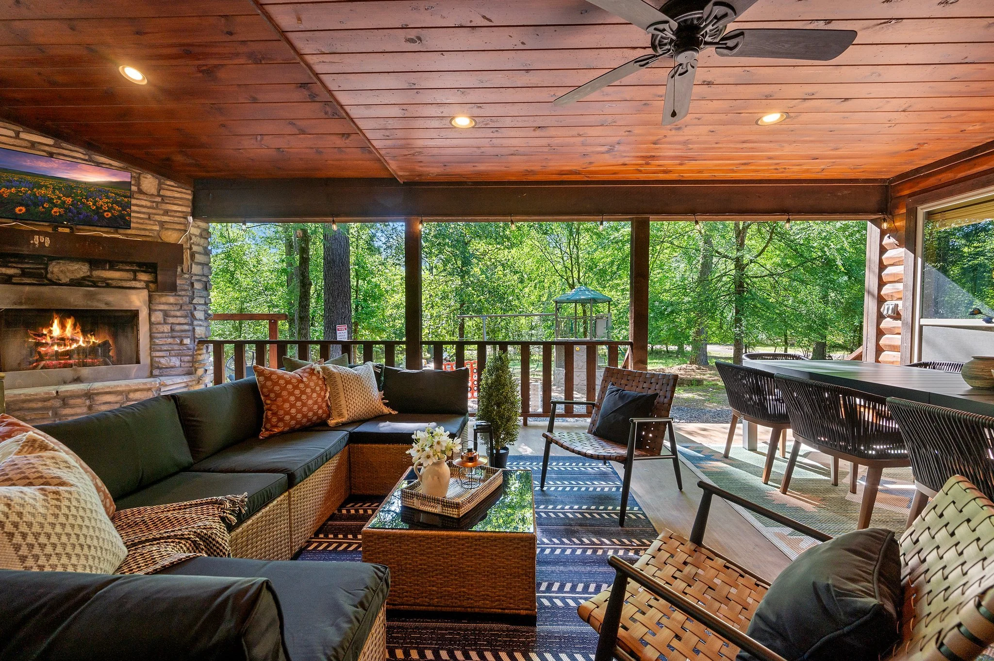 But the magic truly happens outside. The expansive deck invites you to soak in the hot tub, lounge in the comfortable seating area, or catch your favorite show on the outdoor TV. For the ultimate in relaxation, step into the private sauna and let the stress melt away. Families will love the built-in playset for the kids, while evenings are best spent gathered around the fire pit or gazing at the stars from the one-of-a-kind stargazing dome.